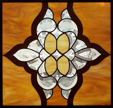 ..Rebecca finally made a window for herself. This masterpiece measures 30” x 60” and consists of 147 bevels with a splash of smooth black and clear and black baroque glass. Now she needs to find just the perfect place to show it off in her home. |